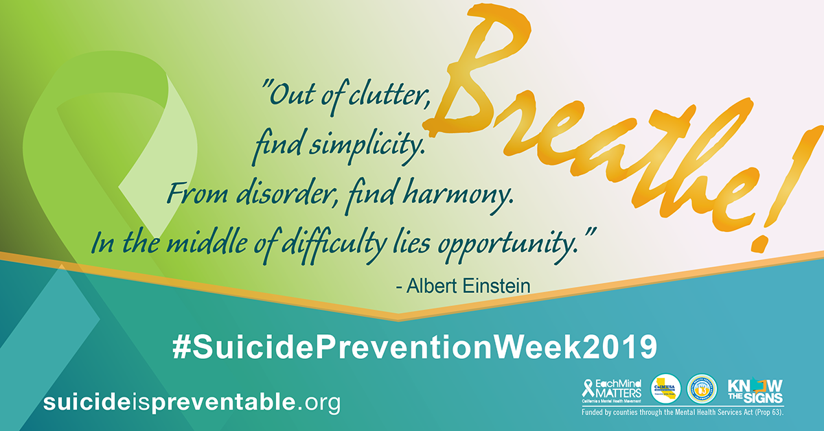 In support of National Suicide Prevention Awareness Week (September 8-14, 2019) and World Suicide Prevention Day (September 10), Each Mind Matters: California’s Mental Health Movement is excited to provide the 2019 Suicide Prevention Activation Kit.